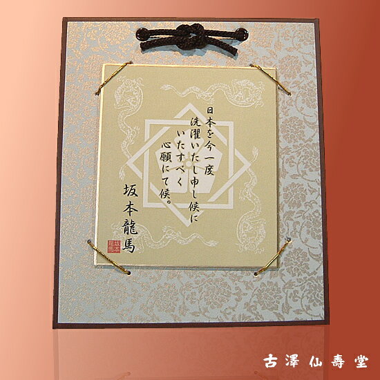 明治維新の立役者、坂本龍馬の言葉です!!京都の小物 和風雑貨 贈り物ミニ色紙 『龍馬』 と色紙掛けのセット 価格: 1,312円 レビュー評価:0.0 レビュー数:0 商品内容「日本を今一度、洗濯いたし申し候」これは、明治維新の立役者、坂本龍馬が28歳(1863年)の時、姉の乙女へ差し出した手紙の中の言葉です。和風の格調高いどんす柄が根強い人気を持つ色紙掛けです。※作品を保護するA-pet(透明カバー)付きです。和風の玄関先や和室、床の間などにお部屋の装飾品としてお部屋に飾ってみてはいかがでしょう!材質【本体】 紙〈紙質〉どんす紙サイズ本体(色紙掛け):縦212×横182mm色紙のみ:縦135×横120mm Supported by 楽天ウェブサービス |